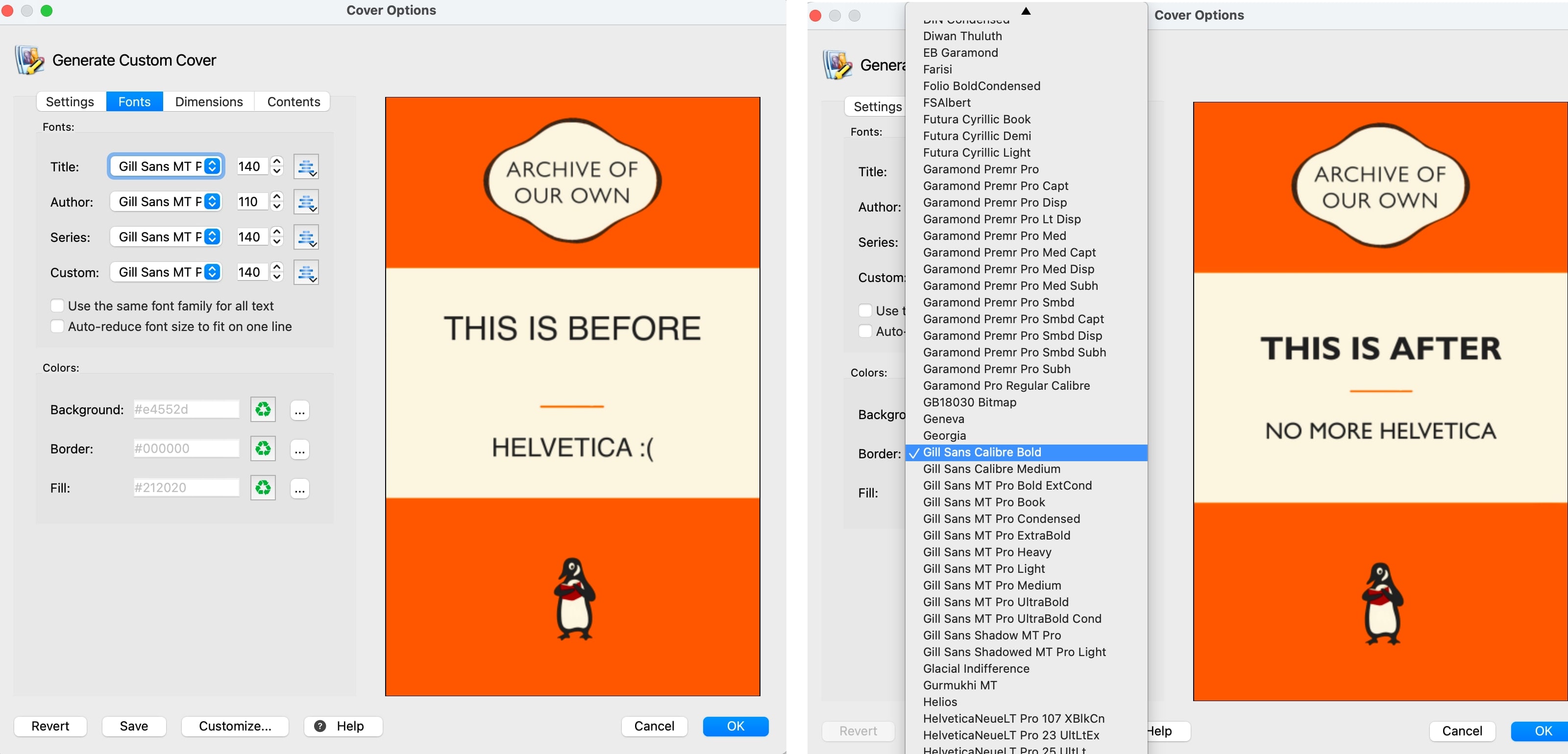There’s no confirmation message from FontForge, but you can confirm it worked by looking in your fonts folder. If the font was successfully regenerated, you'll see a new modified date. Relaunch Calibre if it's open. Your new, working font will be in the Generate Cover font menu and ready to use.