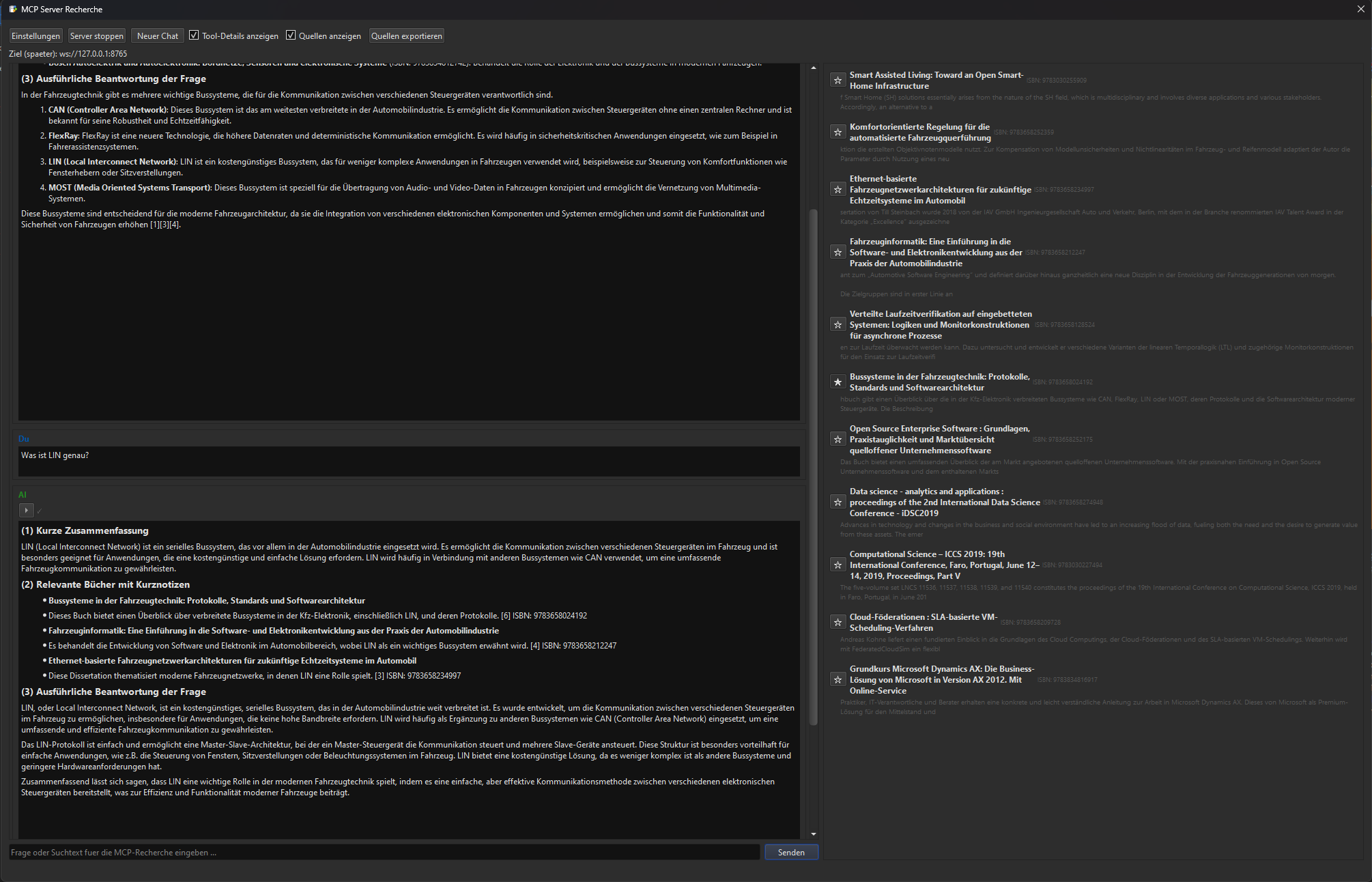 Instead of manually searching by title or tags, you can ask natural language questions and get focused book suggestions – with short summaries, sources, and direct links into your own library. Ask things like: – "Show me practical books on in-vehicle communication, especially CAN and FlexRay." – "Which English books explain basic statistics for engineers?" – "Find books that cover both battery management and vehicle electrical networks." The plugin talks to a local MCP server that reads Calibre’s metadata database and uses AI to search, rank and summarize the most relevant books for your question. FEATURES