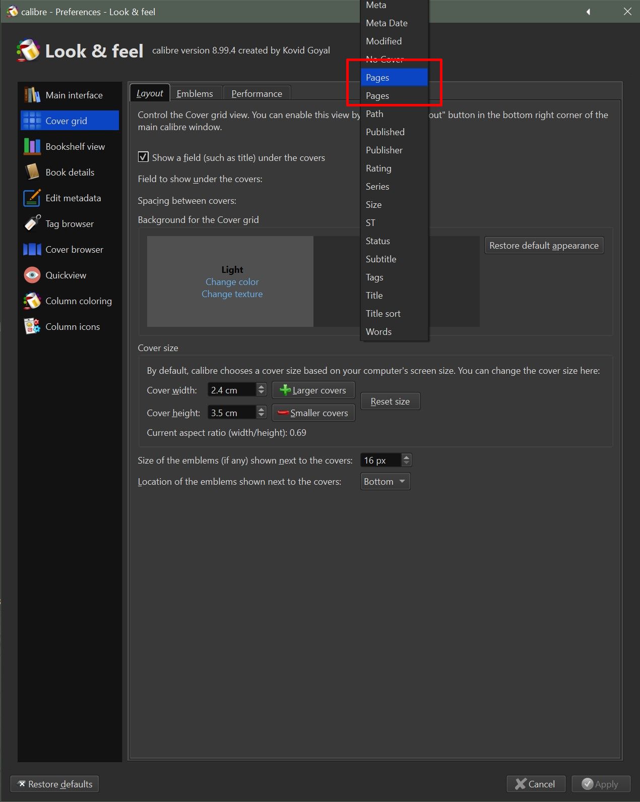 There's only Calibre Pages on the Sort By menu, so I have to switch to table-view to sort by that.