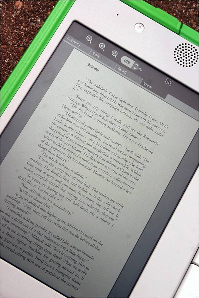 The attached image of the OLPC XO-1 is from Low-Cost, Low-Power Computing by Mary Lou Jepsen and shows its ebook capability. This presentation does not otherwise contain much new.