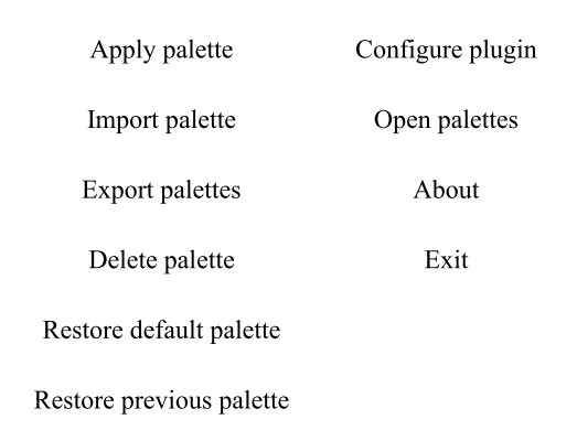 @dunhill - suggestion: separate the operational features — Apply, Import, Export, Delete, and Restore — from the administrative features — Configure, Open (palette folder), About, and Exit.