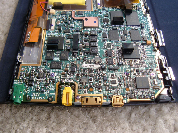 Hey all, just thought I would share these with you. Taking this thing apart was pretty easy. The right side (plastic) silver bumper pops out after unscrewing the one screw on the back, then sliding a slim knife or screwdriver under it (careful, they are fragile!). The Left side bumper has 2 screws holding it in place under the SD card flap. Once those are undone you can pop it out in a similar fashion. There are 4 screw holes on each side of the reader now. Unscrew those as well as the two near the port at the bottom and lift off the back cover (it is hinged at the top). The internals are screwed to the front faceplate. I did not have the time to dissect it any further. Everything went back together the same way with no problems. I did not notice any unused ports or anything fun like that on the motherboard. -lint