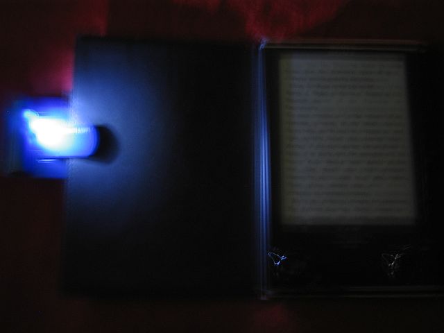 Apologies for the poor focus--the infrared focus light didn't server me well in a dark room without flash--but you get the idea of brightness. This is my first time posting pictures. I don't yet know any way other than the "Attachments" icon, so don't know how to intersperse descriptive text. "Insert Image" requires a URL, but I don't want to host these pics. The pics will be: 1. Package of three, opened 2. Closed with light clipped on the left cover. Shutting the cover causes no damage, but does make it more probably you'll accidentally hit a page button when the screen is on (just click the menu button to get back to the normal screen). 3. Open flat in dark. 4. Open in reading position. Shows brightness, but out of focus. |