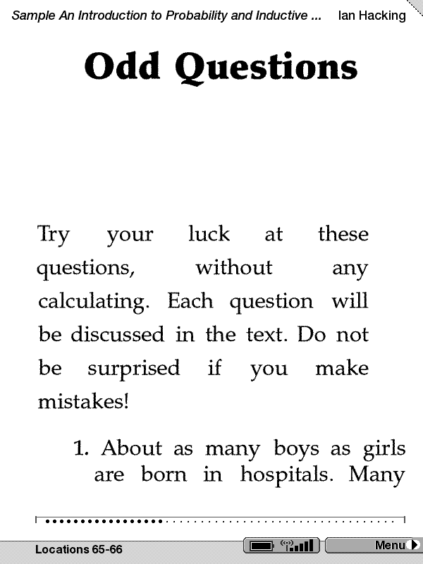 Screenshots of another TOPAZ ebook, An Introduction to Probability and Inductive Logic , for enarchay. These are again font sizes 3 and 4. The (a),(b),(c) lines are very small and don't rescale with the font change, because they are an image. It is possible to zoom images, but this does not help much here.
