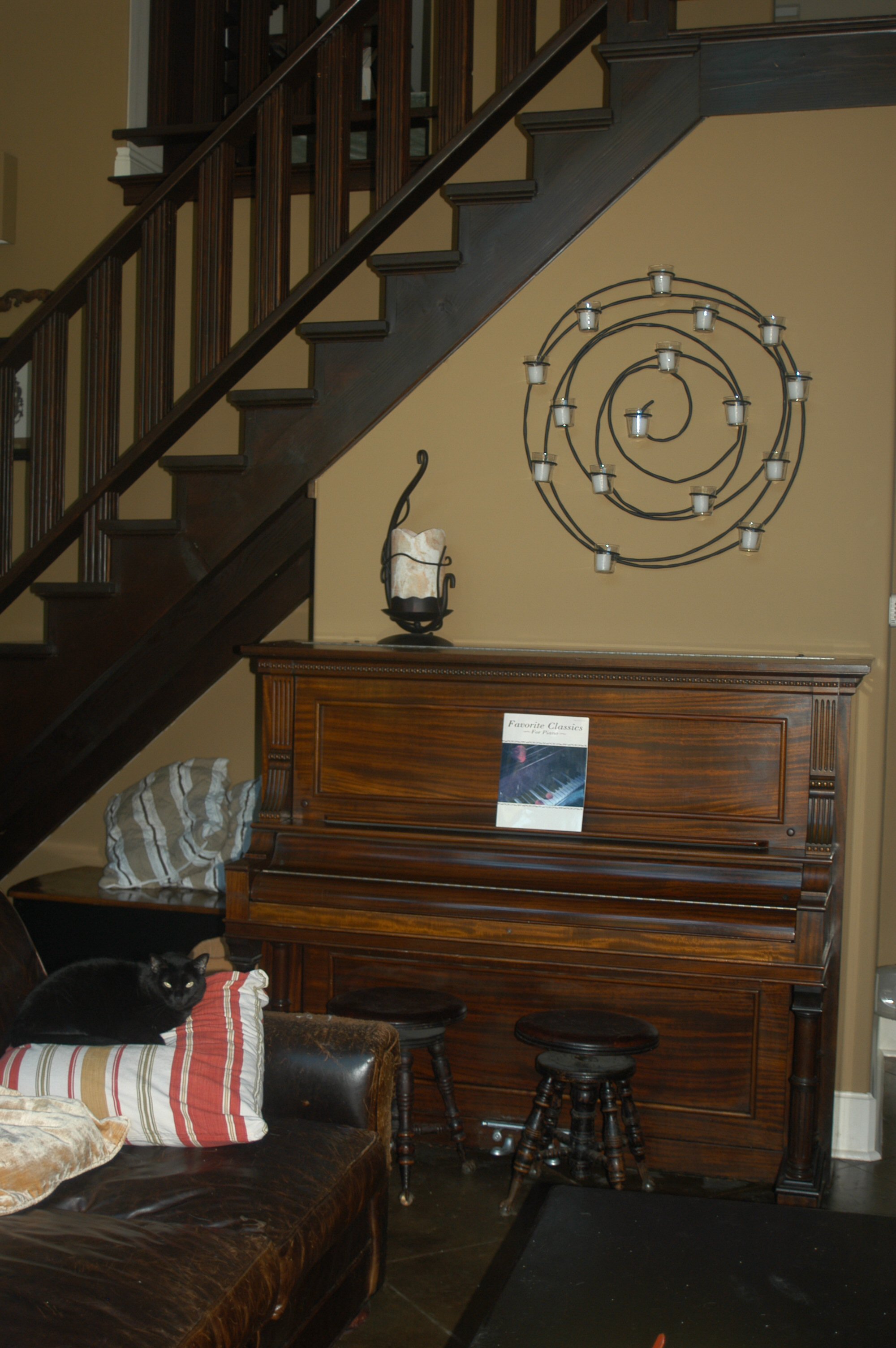It was my grandfather's piano, built in 1901 or something. It was in our house growing up, and I learned to play piano on it. After my mom died, it was pretty much the only thing I wanted, so I got it. This after a long argument with one of my aunts who thought it should go to the museum where my grandfather's papers are kept. You can imagine my response to that. However, it got moved several times, and the cats did a lot of damage to the pedals, so it was a bit of a job fixing it up. I still need to have a tuner work on it. Most of the time now, I just pull out my keyboard, plug it in and play (drives the cats crazy ... the only thing they seem to like is Bach).