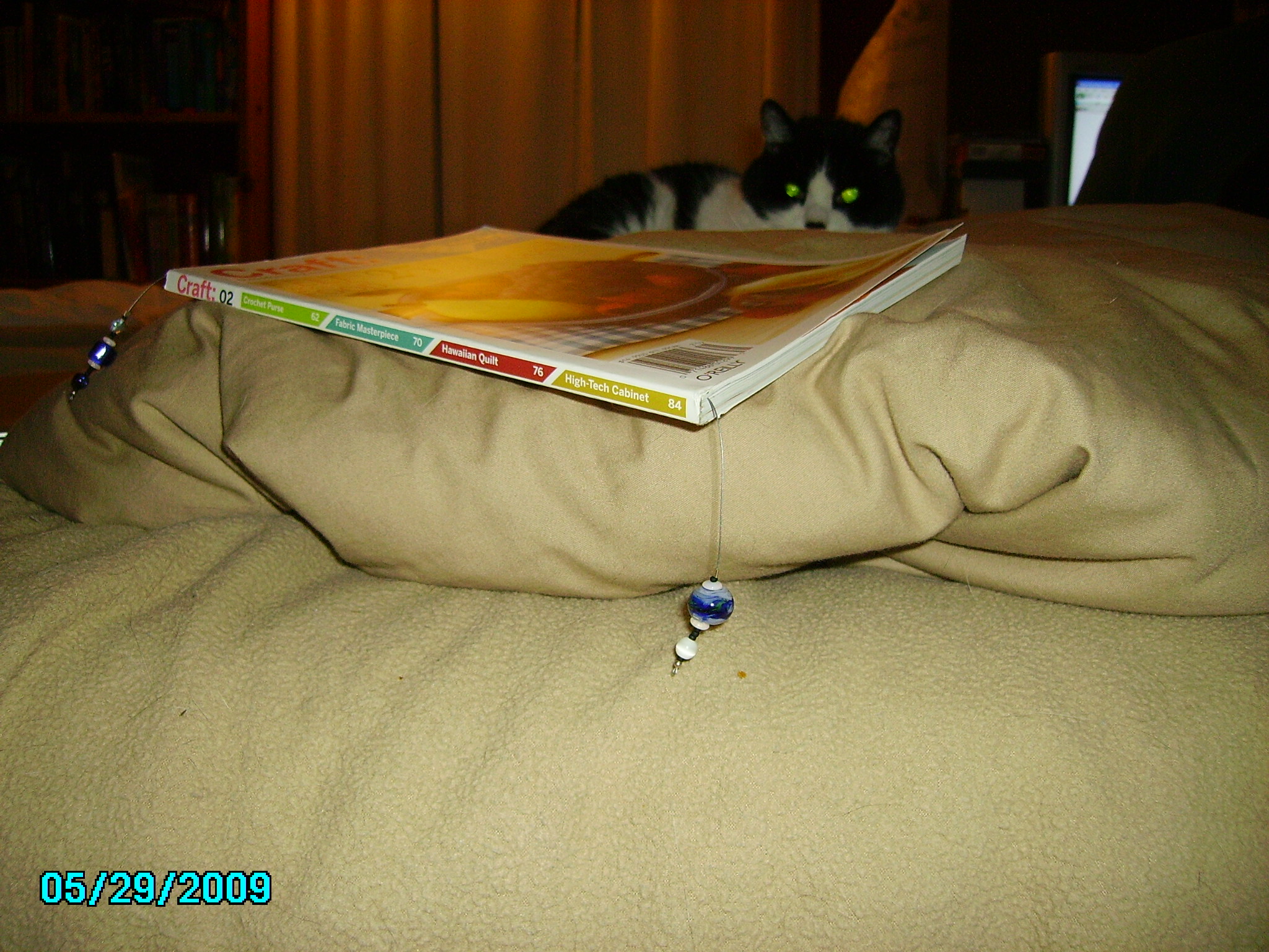 I wear that necklace with a pair of patchwork pants. The black pendant 6th from left was a river stone I drilled through with a Dremel tool. The turquoise necklace next to it has some wire wrap beads that I made. The rest of my necklaces are mostly just stringing in patterns or whatever.Oh-- I meant to include this woven shawl with some of my pottery, too. Also, here's another cell phone charm with thermochromatic beads (like "mood rings"), a bookmark with beads (which doesn't get much use these days), and, finally, my "desk." And Jinian, the Evil Kitty, of course.