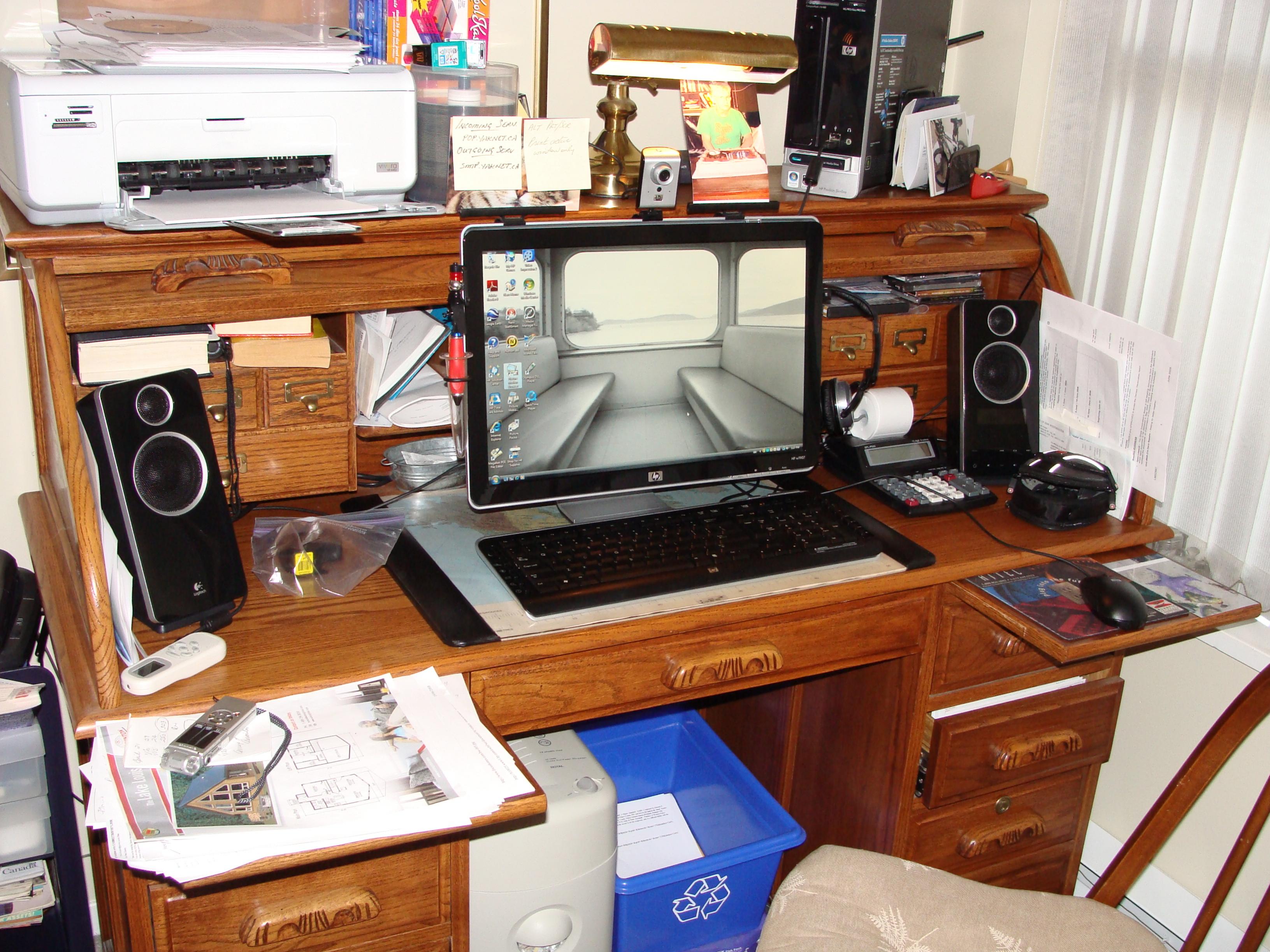 Or in the study.....at the desk that belonged to my DH mother....he's 73 so this thing is old.....Drextal Heritage. Needs refinishing really badly........but a wonderful piece.