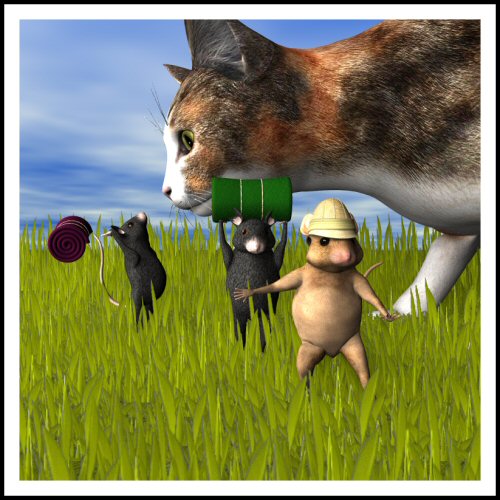 I'm slowly working on a book about the imaginary adventures of some mice. The caption for this one reads "Hush, Kipanya!! You must be quiet! We are in big cat country now!" |