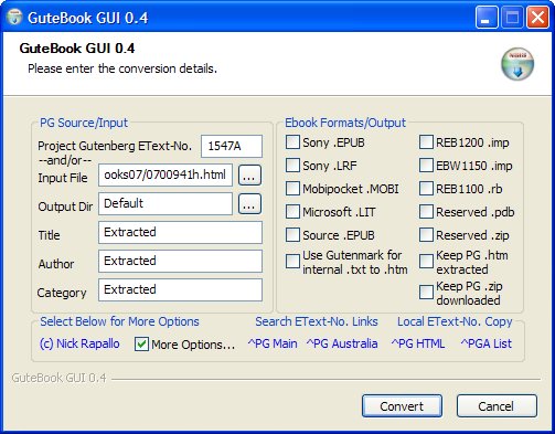 This project was created by Nick Rapallo (nrapallo) and was adapted from the gutlrf.pl code written by FangornUK, 10th Nov 2006 (and as recently modified May 2009). GuteBook (Windows GUI & Perl script) directly retrieves and converts PG or PG Australia HTML files specified by it's EText-No. or URL. PG Australia ebooks require the URL link to the HTML to also be specified in place of the Input File since there is no direct relationship between the PG Australia EText-No. and its URL. Once the HTML is available, the program fixes/filters many HTML items so as to properly create simultaneously many current ebook formats, including, .epub/.lrf/.mobi/.lit/.imp/.rb versions. Warning: the GuteBook-gui.exe and GuteBook.exe both access the internet and retrieve PG advanced search/External programs' webpages and individual .zip/.htm/txt files respectively. To accomplish these ebook creations, GuteBook relies heavily on external programs to facilitate the conversions. It uses calibre's Any2epub/lrf/mobi/lit as well as ETI's eBook Publisher. Afterwards, picky/advanced users can re-edit/tweak the resulting modified .htm and easily re-create the various ebook formats required via dos batch files. Now anyone can become a seasoned ebook creator with this easy to use program. So if your results ARE that good, consider contributing them to our EBook Upload forum (in the various ebook formats). Even mobileread.com's "elite" ebook creators may find it useful... ![]() PREREQUISITES: