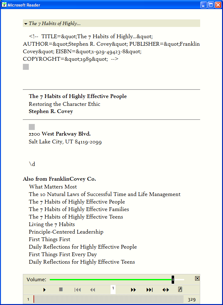 1) Is not converted to a space 2) Centering not respected 3) Page Breaks are not always inserted. (There are two page break before the "Also..." the LIT and ePUB do not process the page break. 4) Images are not included 5) There is a "\d" command that is not processed. It does not look like a valid command. Can it just be removed from the text? This is what dropbook does just ignores invalid commands, but does not include them in the eBook. I've attached some screen shots of PDB->ePUB conversion and PDB->LIT conversion. =X= Last edited by =X=; 06-08-2009 at 03:37 PM. Reason: Added more info |