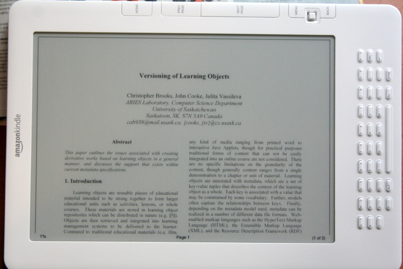 The DX's support for pdfs is currently more than good enough for my needs. Reading technical paper pdfs works extremely well; in landscape mode, they are basically at 100% size. This is fine for most papers, in my opinion. I don't usually annotate my papers, so lack of annotate/highlight is not currently an issue for me. Whispernet already seems to be amazingly easy and useful. In addition to document delivery (which I haven't tried yet), browsing the web and downloading free books from MobileRead and Feedbooks is extremely, gratifyingly easy. Size-wise, my DX in the Amazon case is literally half as thick as my iLiad in the iRex case. The DX is a bit heavier, but since I have custom, heavier batteries in my iLiad the difference is not so striking. I only ever used the pen on my iLiad for navigation; I decided quickly that it was not a useful device for note-taking. I also prefer a physical keyboard to an on-screen one. So the lack of stylus/touchscreen does not bother me. DX issues for me: lack of SD card slot. Lack of folders. Given that the DR1000S is about twice the price of the DX, its advantages are not really enough to recommend it for me. Plus, the DX has several advantages that I quite enjoy. |