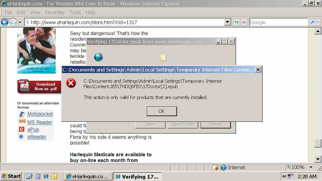 Kelly, I'm not sure what you mean when you say a box came up that asked you how to open it. When I click the link to download the ePub, my choices are Open and Save. If I Save, the file won't open. If I choose Open, I get the attached error message. Any ideas? |