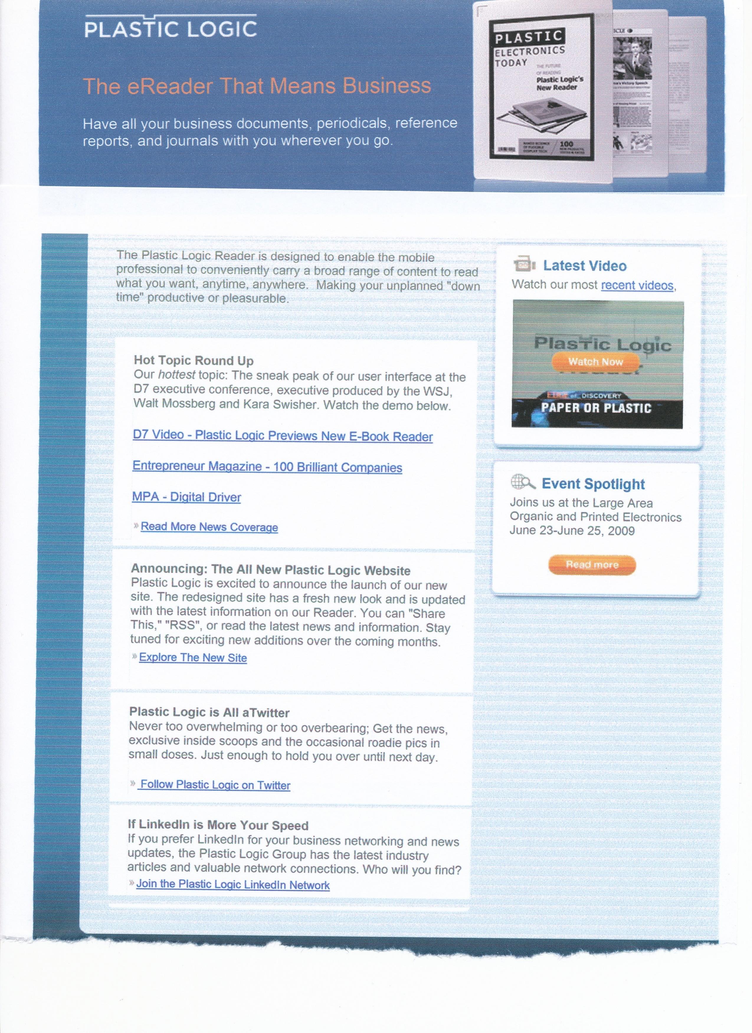 New Email from Plastic Logic. I think the advertisment is longer than the D7 Video but still interesting to view. The page turns appeared slower than the iRex Digital Reader.