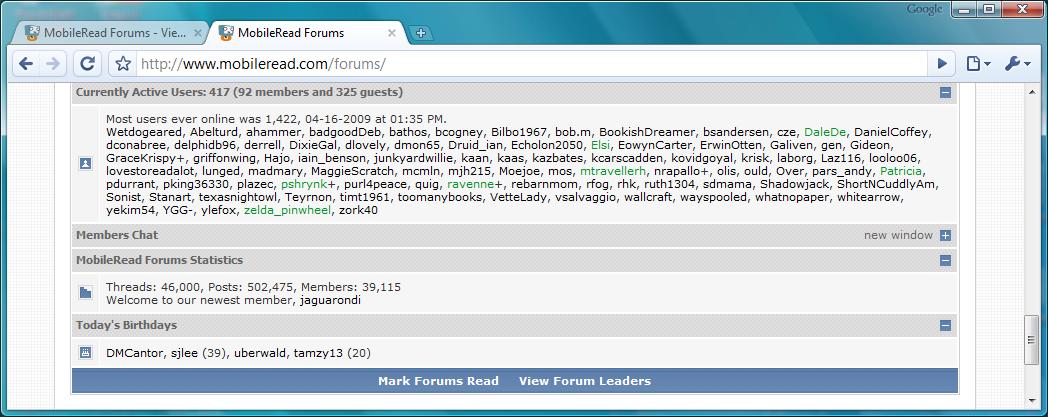 [Edit] Yes - this is the 46,000th thread on Mobileread. Last edited by pdurrant; 06-30-2009 at 05:51 PM. |