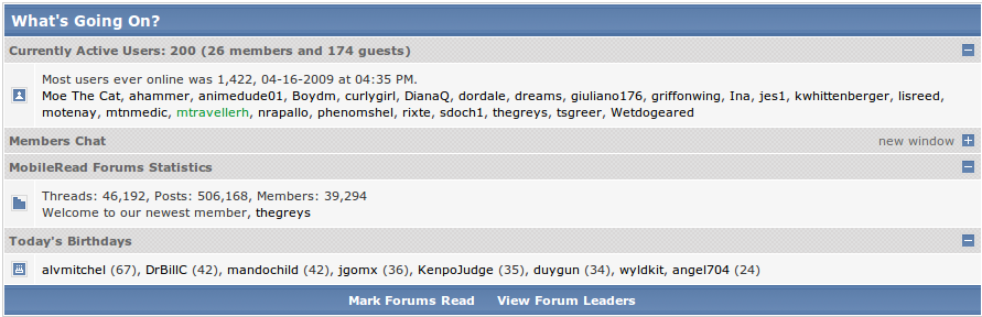 ![]() EDIT: The same thing happens with the Who's Online quick link; basically there are hidden members as the members count doesn't equal the stated number of members online. Alexander has some serious backdoor issues to deal with now...