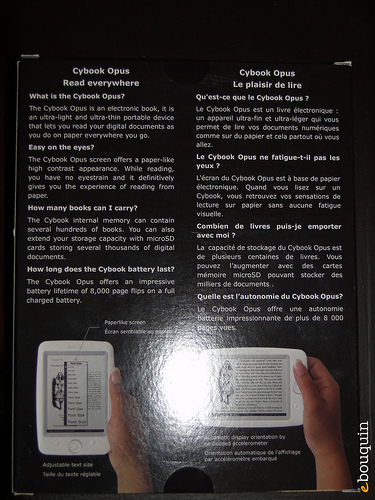 http://www.ebouquin.fr/2009/07/05/no...u-cybook-opus/ http://www.flickr.com/photos/ebouqui...7620963287700/ and i've attached a selection from the Opus Unboxing (taken by clément). i'm sorry to say i didn't take any photos at all myself last night ![]() Quote: