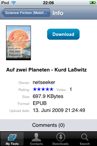 Anzeige, Bedienung und Lesekomfort sind zwar bei Weitem noch nicht so ausgereift wie bspw. bei Stanza aber zumindest kann man nun endlich auch ePub-Dokumente direkt von txtr.com auf iPhone/iPod herunterladen und anzeigen.