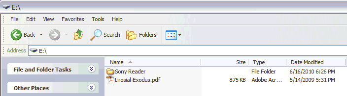 Now just copy any compatible eBook file onto the SD card. In my second attached file ("SonySDCard.gif"), you'll see that I copied a PDF file into the root directory. And in the third attached file ("SonySDCard-2.gif") you'll see that I uploaded an ePub file into the drive:\Sony Reader\database directory. The fourth and fifth attached files ("SonyScan-1.jpg" and "SonyScan-2.jpg") show these two books on the Sony reader. Note the little icon next to the title indicating that the book is on the SD card. |