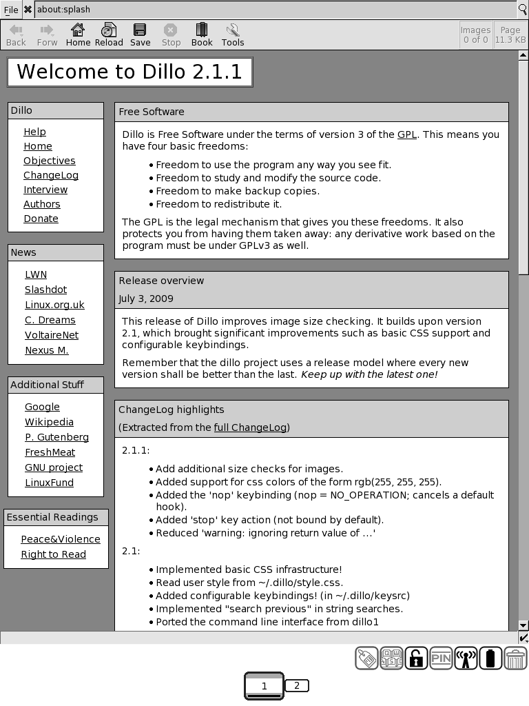 Thanks to the kind guys over dillo-dev mailing list, now I have compiled successfully dillo2 for the iliad! This is a straight compile, so no input yet (argh!), but it is coming. See attached screenshot. If you want to test it yourself, the binary is also attached, but beware that it isn't very useful yet because of the lacking soft-keyboard support. Last edited by Antartica; 07-10-2009 at 09:34 AM. |