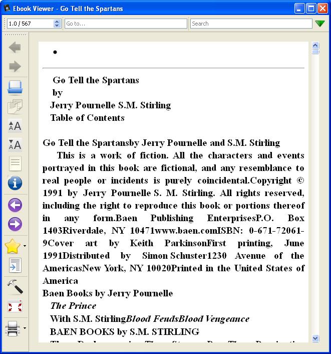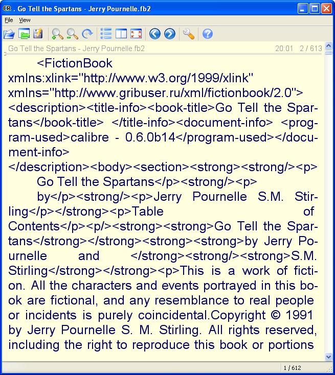 calibre beta 14 mobi file from baen Conversion of any format to fb2 still seems to not be working in b14. Tacked on some screenshots from cr3 and calibre reader to show what is generated. This is what has happened to every book I've tried to convert to fb2 lit, mobi, epub the source format doesn't seem to matter. The calibre reader renders text that is readable but cr3 is showing all of the tags. Thought it might be a problem with the WinXp version of the cr3 but my linux version of cr3 shows the same thing and the WinXp cr3 can display my other fb2 files alright. |