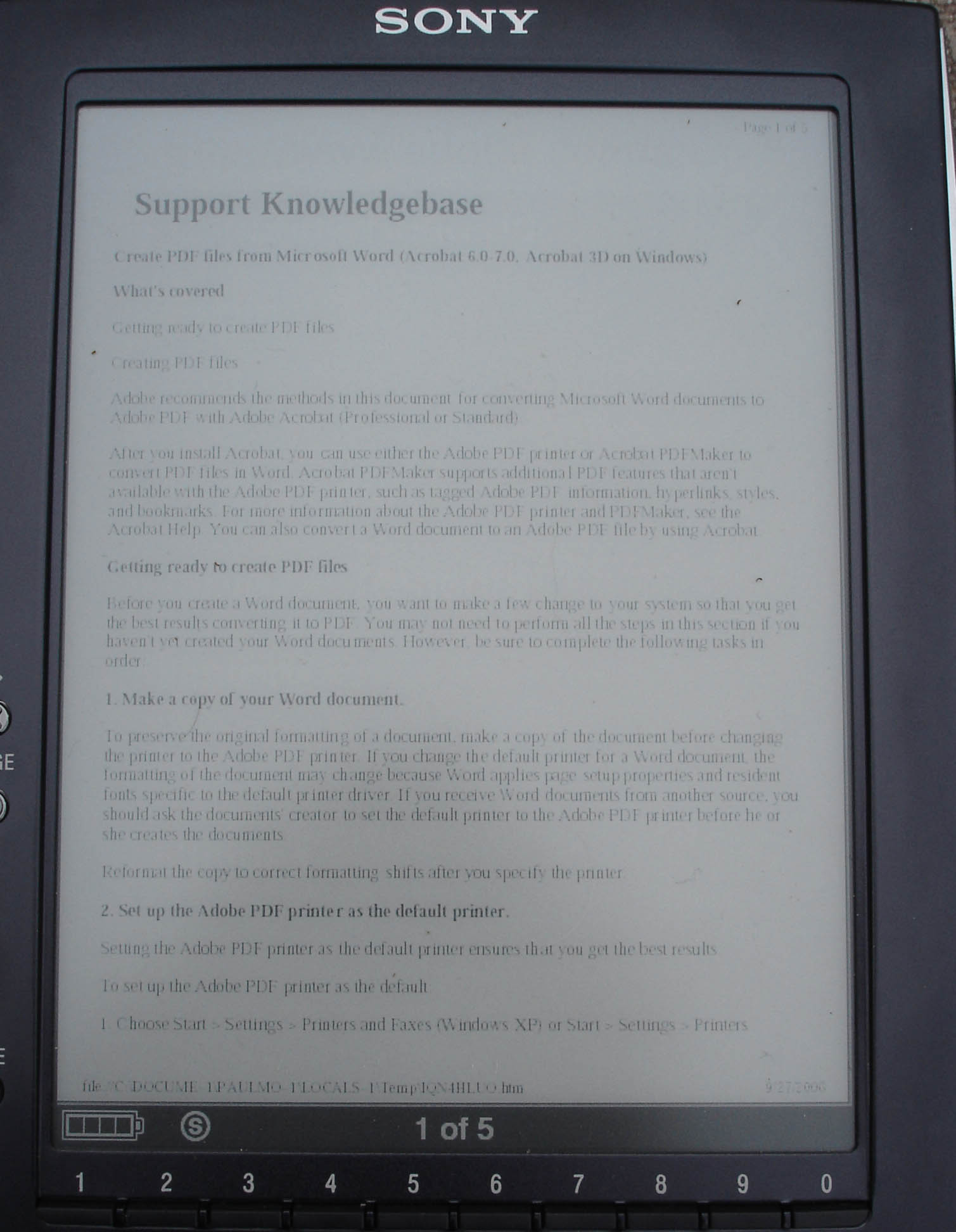 up enough to read. I find that most letter size documents can be read by using the landscape mode and holding the reader an inch or two from your nose. As well the size button, switches between "fit width" and "fit visible", sometimes helps if there is white space at the top or bottom of the page. I'm not sure what Sony means by "fit width" and "fit visible", it doesn't seem to know about margins? or does it ? maybe it knows where type starts and ends. If it does work the page is shown at a higher magnification - works in landscape or portrait. |