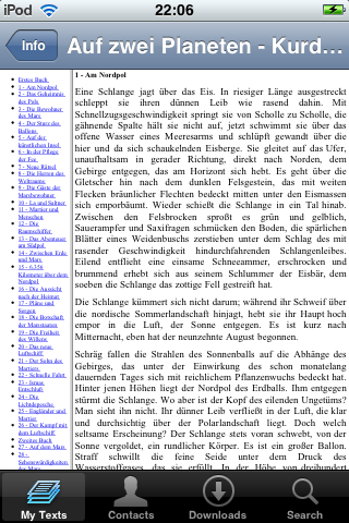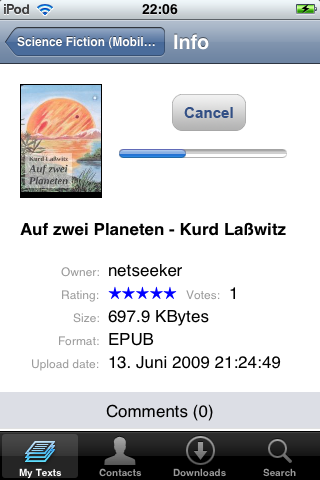 Anzeige, Bedienung und Lesekomfort sind zwar bei Weitem noch nicht so ausgereift wie bspw. bei Stanza aber zumindest kann man nun endlich auch ePub-Dokumente direkt von txtr.com auf iPhone/iPod herunterladen und anzeigen. Im AppStore ist die Anwendung unter dem Namen "txtr" zu finden... Last edited by netseeker; 07-09-2009 at 05:50 PM. Reason: Screenshots hinzugefügt |