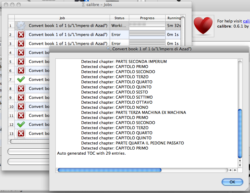 a regular odt file, with one image, h1 and h2 header for parts and chapters. At first, during conversion, I managed to get calibre detect parts and chapters, but the conversion process get stuck at this point. after a little correction fo the odt file, this is what I get during conversion: Convert book 1 of 1 (u"-----------------") InputFormatPlugin: ODT Input running on /Users/T/Documents/libreria calibre--------------- Extracting ODT file... Traceback (most recent call last): File "<string>", line 1, in <module> File "/Applications/calibre.app/Contents/console.app/Contents/Resources/lib/python2.6/site-packages.zip/calibre/utils/ipc/worker.py", line 90, in main File "calibre/gui2/convert/gui_conversion.pyo", line 17, in gui_convert File "calibre/ebooks/conversion/plumber.pyo", line 648, in run File "calibre/customize/conversion.pyo", line 217, in __call__ File "calibre/ebooks/odt/input.pyo", line 65, in convert File "calibre/ebooks/odt/input.pyo", line 36, in __call__ File "odf/odf2xhtml.pyo", line 1291, in odf2xhtml File "odf/odf2xhtml.pyo", line 1299, in xhtml File "odf/odf2xhtml.pyo", line 1284, in parseodf File "xml/sax/expatreader.pyo", line 107, in parse File "xml/sax/xmlreader.pyo", line 123, in parse File "xml/sax/expatreader.pyo", line 207, in feed File "xml/sax/expatreader.pyo", line 338, in start_element_ns File "odf/odf2xhtml.pyo", line 486, in startElementNS File "odf/odf2xhtml.pyo", line 476, in handle_starttag File "odf/odf2xhtml.pyo", line 999, in s_text_h File "odf/odf2xhtml.pyo", line 521, in classname File "xml/sax/xmlreader.pyo", line 316, in __getitem__ KeyError: (u'urn asis:names:tc pendocument:xmlns:text:1.0' , 'style-name')