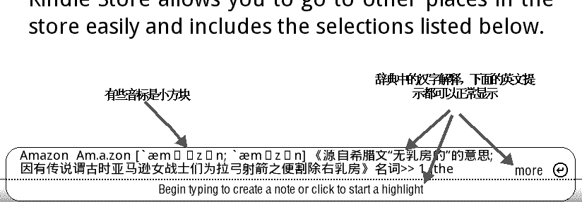 Your post is very helpful. But after I load the E2C dictionary, the chinese characters are displayed by boxes because of the unicode problem as you said. How do you get around this? I tried to follow your "but you can click enter key to view chinese translation and press back button to continue read book.", but the enter key does not return the chinese character. Many thanks, Josh ---------- Ok, I have found the way to display the chinese characters: http://blogkindle.com/unicode-fonts-hack/ But, the fond type becomes different. The annoying thing is the smaller line spacing, which makes the reading uncomfortable. Anyone can help? Last edited by tekuate; 08-12-2009 at 11:53 AM. |