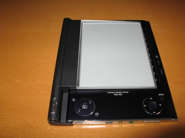 I ordered a Sony Reader Pocket last week and had it arrive on 09/12/2009 (I've done all my reading in the past on old Handspring Visor PDAs hoarded from Ebay.) I made a few reference photos of the screen. Photographing it wasn't easy-- inside lighting isn't bright enough, but it was deeply cloudy for the first couple of days I had it when I was trying to take the photos, so outside lighting wasn't much better. (Couldn't use flash because of glare off the glass, and scanning it on my flatbed scanner gave a glare, too.)