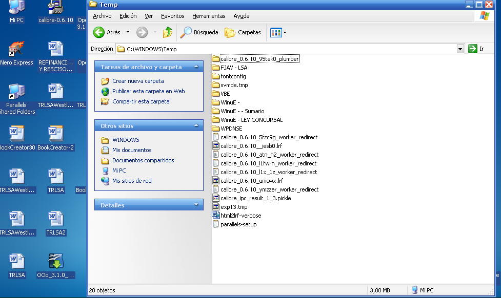 First of all, I did not say before that your tool is really great, thanks for it. I was using 2.0 with Calibre 0.5 and the debug file I used first is for that versions. Now I have tried with 3.0 and Calibre 0.6.10 and I cannot set the debug mode on and cannot even get the html file in Windows/Temp. I attach here a screen capture of Windows/Temp after running BookCreator 3.0 in Word 2004. I will uninstall Calibre 0.6.10 and install BookCreator 2.0 and Calibre 0.5 just to recreate what I said before. By the way, I did not understand what you said about running debug in command line. Could you give me a wider explanation, please? Regards, PS: I attach the debug file using BookCreator2 and Calibre 0.5 and a screenshot of the Windows/Temp/**File with its contents Last edited by efejota; 09-14-2009 at 05:27 PM. |