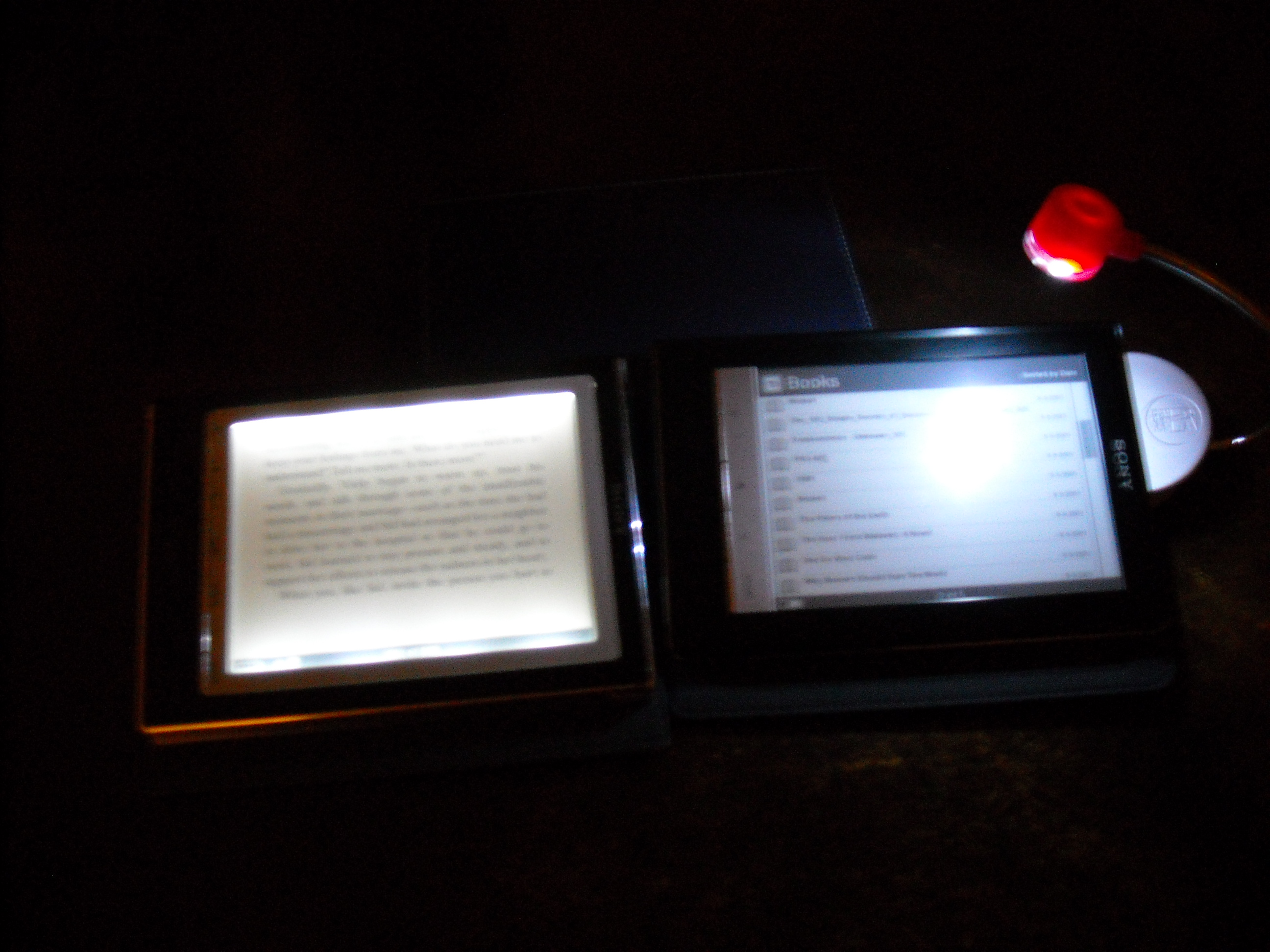 Someone was trying to compare it to that garbage Sony sold for the 505. There is no way to compare the two as the 505 used a sidelit transluscent plastic shield that made everything fuzzy. The 300 and 600 light covers are more like a larger cover with a built in LED overhead light similar to the MightyBrights. The light cover for the 300 is not too big, for me anyway, but I could see how the extra width on a 600 might bother some people. BTW: The Best Buy in south Arlington, TX has both light covers (for the 300 and 600). Last edited by jswinden; 09-23-2009 at 07:33 PM. |