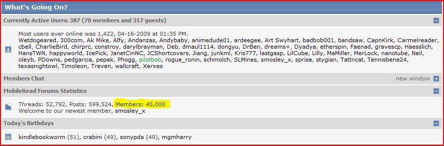 Membership has increased by 5,000 to 45,000 members (12.5%) in the last 10 weeks. That's an incredible rate of growth. With all of the new devices recently released and the many more that are coming, I'm sure it won't take long to reach the 50,000 mark. Congratulations Alex, forum leaders and members of MobileRead. Welcome to our newest member, smosley_x. |