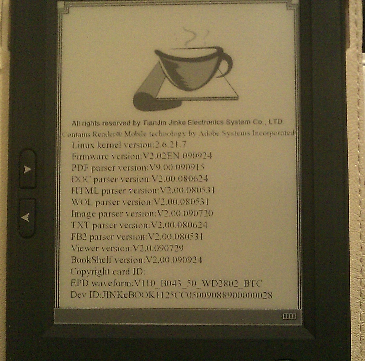 "All rights reserved by TianJin Jinke Electronics System Co. LTD. Contains Reader® Mobile technology by Adobe Systems Incorporated. Linux kernel version: 2.6.21.7::2.6.21.7 Firmware version: V2.01ASTAK.090825::V2.02ASTAK.090907 PDF parser version V2.00.090730::V2.00.090907 DOC parser version: V2.00.080624::V2.00.080624 HTML parser version: V2.00.080531::V2.00.080531 WOL parser version: V2.00.080531::V2.00.080531 Image parser version: V2.00.090720::V2.00.090720 TXT parser version: V2.00.080624::V2.00.080624 FB2 parser version: V2.00.080531::V2.00.080531 Viewer version: V2.0.090729::V2.0.090729 BookShelf version: V2.00.090825::V2.00.090907 Copyright card ID EPD waveform V110_B043_50_WD2802_BTC Dev ID: JINKeBOOK1125CC05009089200000154 These are the updates on the Astak Pocket Pro, i.e., Hanlin v5. however, your first picture, with the Hanlin update, I never saw on my system. Maybe because I had it off when I started the download??? |