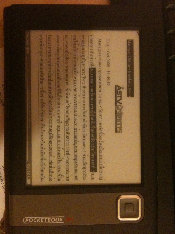 Please, have a look at this Thai book at my PB301. Sorry for quick iPhone pictures. All I did was copying one of the True Type Fonts, supporting Thai, Angsa.ttf, to the /system/fonts on the device memory. After that I opened the book and changed the setting to this font and auto encoding. Voila, it works! Here is the link to a bunch of unicode Thai fonts: http://www.wazu.jp/gallery/Fonts_Thai.html The shipping and and handling cost to Thailand is $60. |
