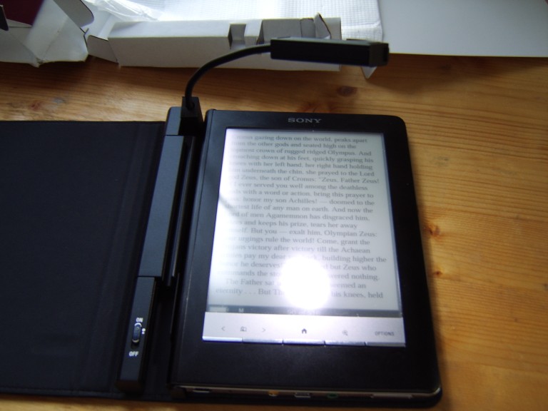 I made a video of a few minutes detailing what's in the package, how it looks and my initial reaction, which can be found on youtube: http://www.youtube.com/watch?v=QNpg6YIMWPs Please excuse my mumbling, I am alas no native speaker and the camera microphone is not as amazing as I would like. Attached to this post are a few foto's I took as well, hopefully giving an idea whether this thing is worth the $59.99 Sony charges for it. Truth be told, I do not think so, at least not for me. The cover is fairly well thought out (it seems small magnets clamp it shut for example), the leather on the outside looks genuine and within it the reader looks good, professional in my mind - something you can savely bring to a meeting. I still wonder why there is no agenda functionality on the reader itself, but that is another matter altogether. I do have some doubts about the sturdyness of the cover itself, as can be seen in the movie: it is easily bend, giving an impression of containing little more than hard leather and some cardboard. The main reason I bought this cover was because when I put the reader in my bag I do not wish other objects to exert pressure on the screen. While this prevents that to a certain extend, I would feel better had it been made of a hard, inflexible material. The light now sits on a flexible wire that moves into position easily. A simple switch provides the ability to turn it off, dimmed or full on. Using the wire it can be positioned both at the top or side of the reader, for those reading in landscape mode. Since this is a led light, energy consumption should not be too high and from what I gather battery-life is indeed fairly decent at several weeks with normal use. Glare is no issue in normal reading position, but under too big an angle it becomes somewhat anoying, making it not ideal to quickly glance at your reader when it's laying down at your desk (though of course, on those situations you'd probably have a desk light). Less easily discarded is the size of the light - ideally it would span at least a considerable portion of the width of the reader to provide a homogenous illumination, but it is somewhat on the small size for my liking. Since the wire is short the light can never be positioned too far away from the reader so a noticeable diffusion in brightness can be observed. Good, but not ideal. What does speak in favor however is the color of the light: it is very white which actually increases the contrast of the reader, compared to normal lamp light. Text looks good under it, and in a perfectly dark room still very well readable (though read above restrictions). So in conclusion; PRO: + Professional, sleek looks (especially combined with a matching reader). + Fairly decent protection for the screen. + Light increases readability & contrast. + Outside feels like real leather, won't deteriorate in a hurry. CON: - Light is too small, somewhat uneven illumination. - Cover is not hard, still allows some pressure through. - Glare issues under less than ideal circumstances. - Excessive pricing compared to a $5 reading light and $25 normal cover. I got my cover as a gift, but had it been otherwise I would not have even considered buying it for this price - alas for being a poor student. It is essentially little more than a normal $25 cover with a decent, but not extraordinary light. I have read plenty at night, and a candle or normal lamp works just as well. On the other hand, it does look like it will survive ten years easily, as such it is not a bad investment - and if you're spending anyway, spending a bit more to get it complete is not a bad idea. |