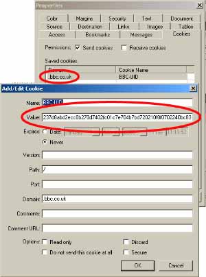 Then, you need to fish out the cookie that MyBBC created for you. I recommend using Phoenix or Mozilla for that; there you can use the cookie manager to find the right cookie. Find the Cookie with the name "BBC-UID". Then open iSiloX and go to the MyBBC entry. Double Left-Click. Go to the Cookies Tab. Double Left-Click on the one saved cookie there. Now, copy and paste the value from YOUR cookie to the value field in iSiloX cookie tab. See attached image. |