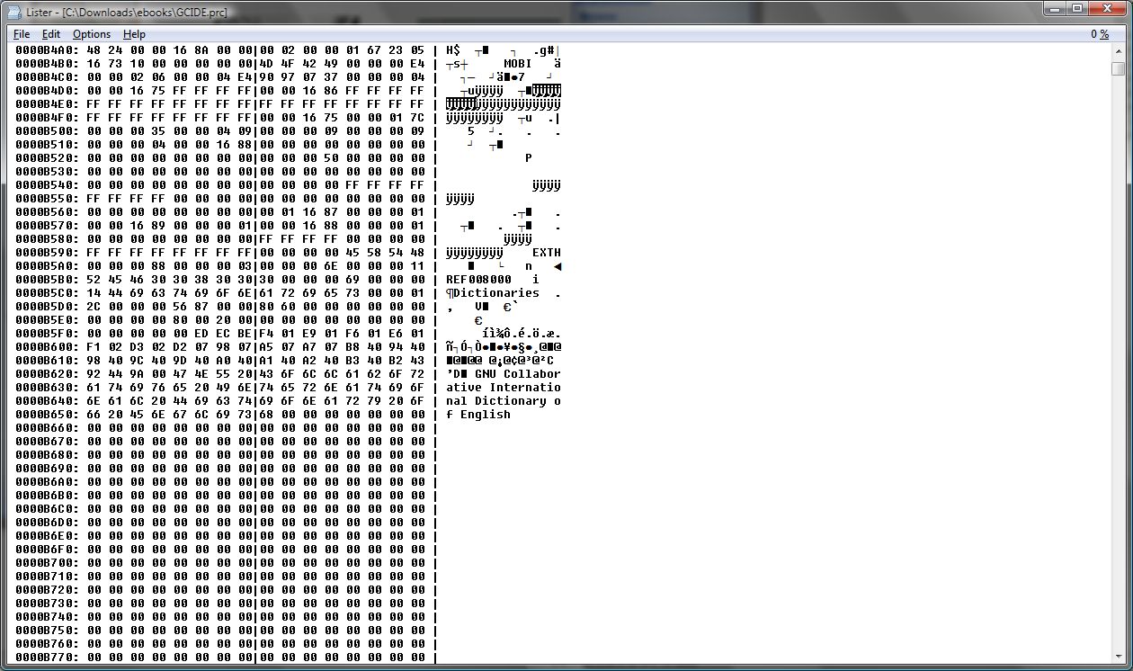 I will post a screen capture as an example. Usually you can recognize a dictionary because of a smaller number of FF in the header. In my example it's 28 (a book usually has 40). But search with a hex editor for 20 FFs lets say. After the last FF in that group, ignore the next 12 bytes (I don't know what they are), and the next 12 bytes you need to modify, each group of 4 represents a language code. In the picture attached, it is 04 09, then 09, then again 09. 09 is English, 04 09 is American English. I found in my tests with dictionaries that patching these to English I don't have problems and no more error messages: "can't open the default dictionary". I hope it helps a little. |