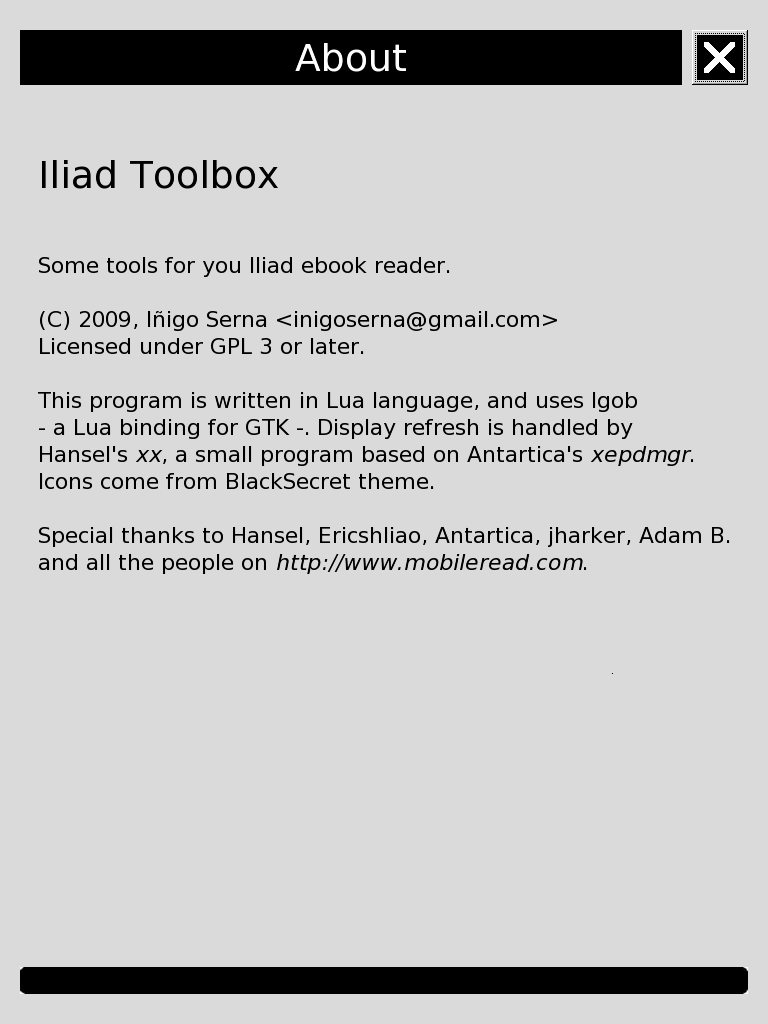 Iliad Toolbox has been written in Lua language and uses lgob (gtk+ bindings for lua), both compiled and packaged for Iliad by Great Hansel. Display refresh is handled by Hansel's xx, a small program based on Antartica's xepdmgr.