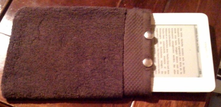 Meine Freundin fertigt mir aus weichem, braunen Frottee Stoff zwei Kindle Socken mit Verschluss.