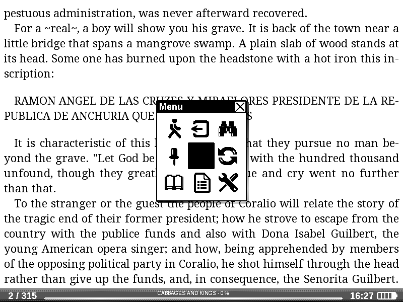 Pix-06.png - menu from inside FBreader. Icons mean: go to page, exit book, search inside book, bookmark, close this menu, rotate screen (auto or four basic rotations), notes (including text clipping), dictionary, settings.