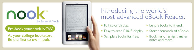 http://www.digitaltextbooks.com/ If B&N runs your campus bookstore, then currently this is the company that you'll buy digital textbooks from. (One of them, at least.) There should be a page for your school, but it only exists if some of the textbooks your school uses are available in digital form. There aren't all that many digital textbooks out there at the moment, so I wouldn't hold your breath. But you can check for a dedicated page by googling: "your school" site:bn.digitaltextbooks.com. My school, for example, doesn't have a page. So far as I can tell none of the textbooks my school uses are available. Last edited by Nate the great; 11-14-2009 at 10:50 PM. |