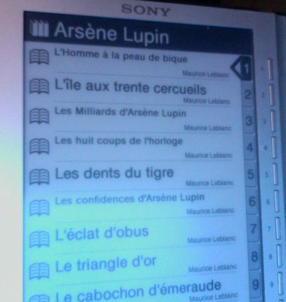 - par ordre - par titre - par auteur - par date par ordre, c'est l'ordre dans la série (ou, si il n'y a pas de série, je *crois* que c'est l'ordre d'arrivé, mais j'en suis pas sûre là), et c'est pas la même chose que par date. par contre, détail un peu frustrant, tu ne peux voir le numéro dans la série que si tu l'ajoutes dans le titre ; par exemple, j'ai actuellement 8 livres de la série Lord Peter Wimsey de Dorothy Sayers. ils sont triés par ordre, donc ils apparaissent dans l'ordre chronologique, mais il ne s'agît pas des n°s 1 à 8 mais des n°s 1, 2, 3, 5, 6, 11, 12, 13. sauf que ça, je le sais parce que j'ai regardé dans calibre. pas moyen de le savoir sur la liseuse, à moins que cela m'ait échappé, ce qui est quand même embêtant... mais bon, il suffit de rajouter le numéro devant le titre pour régler ce problème. Quote: