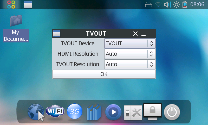Under Linux, I found the tool for HDMI off the System Tools menu where GDebi and PCMan are located. It's called Tvout Gui. When it's tapped, a window appears entitled TVOUT with three settings--TVOUT Device, HDMI Resolution, and TVOUT Resolution plus an OK button. The default settings are TVOUT Device (TVOUT), HDMI Resolution (Auto), and TVOUT Resolution (Auto). The only other option for TVOUT Device is HDMI. Changing Auto to any of the other settings for HDMI Resolution and TVOUT Resolution did not help with any of the three LCD monitors I used to test the V7.