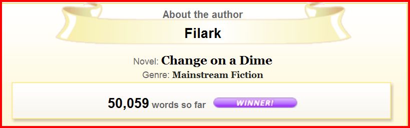 As it happens, I hit 45,000 words tonight which puts me back on track to win! I am so excited, jazzed, stoked . . . ![]() By the way, I see Tekchic is about to win as well!! ![]() ![]() Fi Last edited by Filark; 11-28-2009 at 03:05 AM. |