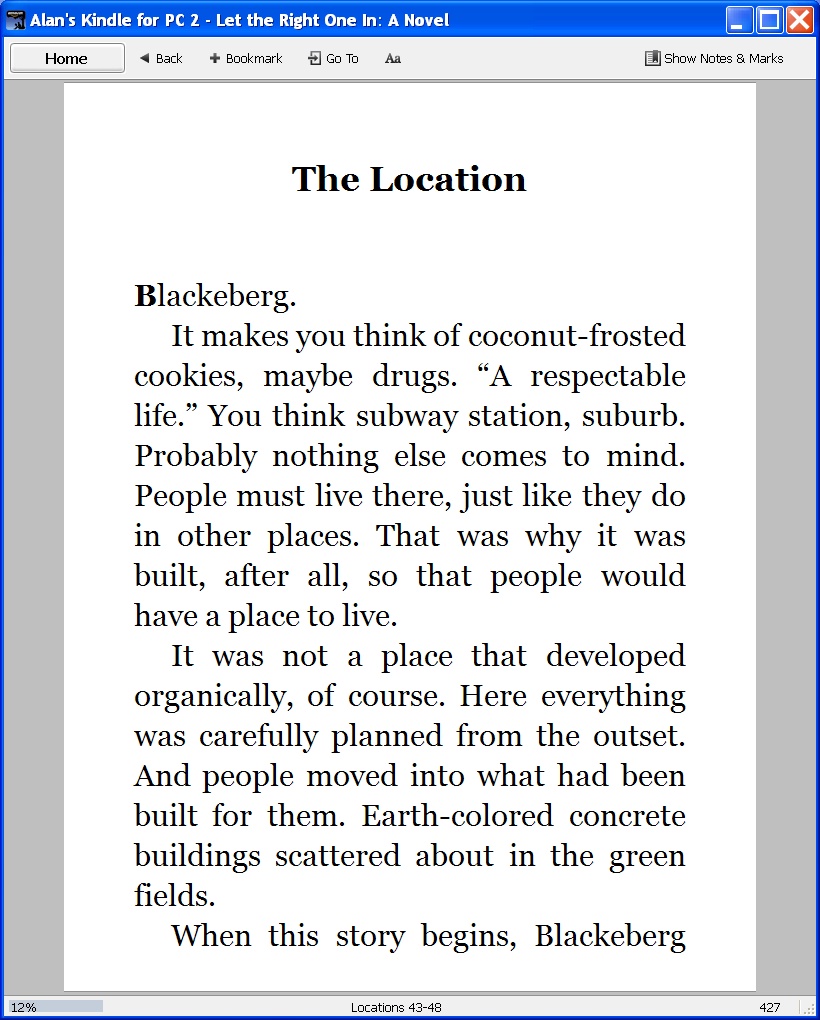 There are two copies of this ebook, B002EPNHD6 and B002KYHZJS. You have B002EPNHD6 with the screwed up dropcaps, but B002KYHZJS (Let the Right One In: A Novel) seems to be ok. See the attached screenshots. The 2nd version has a better cover and a table of contents.