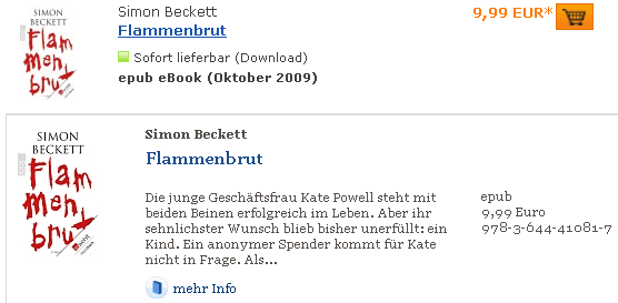 Ohne alberne Buchpreisbindung würde ich Rowohlt empfehlen, die eBooks zu einem regulären Preis bei Libri & Co. zu verkaufen und zu einem deutlich günstigeren auf der eigene Seite. Durch die eingesparten Provisionen an die Shops würde für den Verlag immer noch mehr in der Kasse bleiben. Aber davon sind wir realpolitisch sehr weit entfernt. |