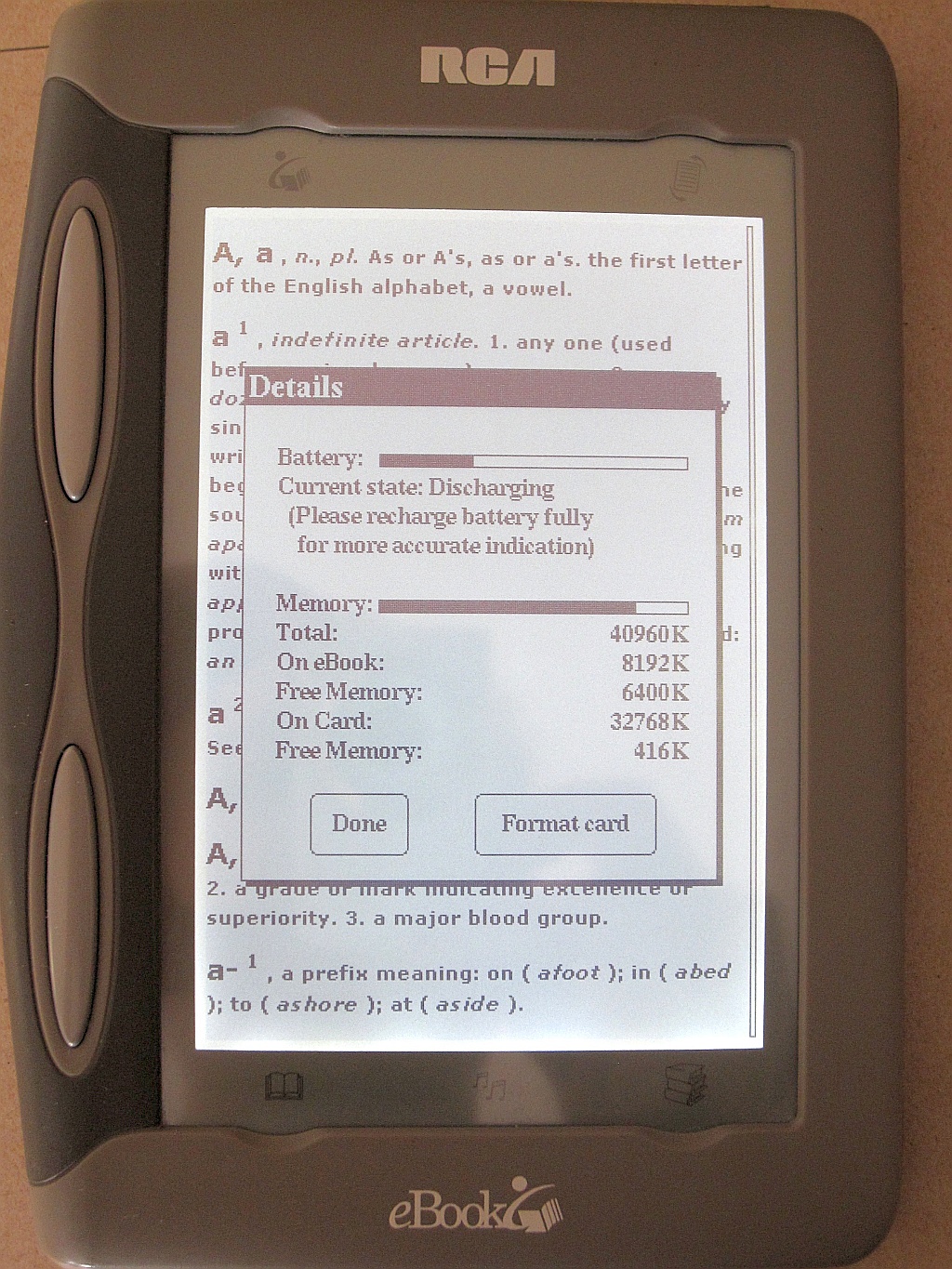 Hmmm... I don't have a "format card" button when I push "details", even though it shows the card is there. I REALLY don't trust the "format ebook" option on Ebook Librarian. I did it once accidentally and it killed my first REB - nothing but the dreaded "grid screen" and no amount of using the published "fixes" would rescussitate it. Thankfully, I found another one, NIB, for cheap.