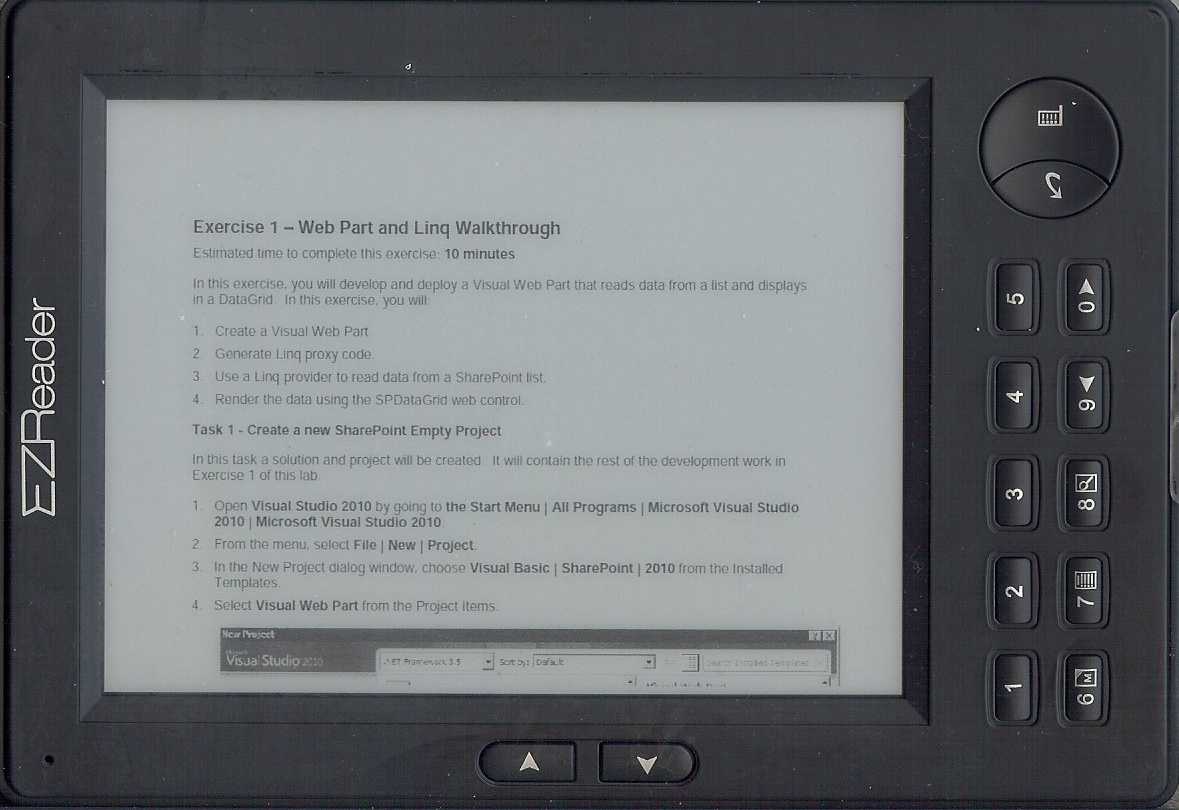 Scans from HOL1_Manual_VB.pdf at SharePoint 2010. The first two are using XPDF in landscape, which has full screen and landscape modes with margin cropping but does not reflow and does not support Adobe DRM. The second two are the same page using Adobe Digital Editions, it does not crop the margins. The next two are ADE with reflow, all the text is displayed but the image is moved to the end of the page. Don't forget the actual screen is only 3" by 4", and I find the landscape full page modes to be unreadable (they do give you an idea where the images are though).