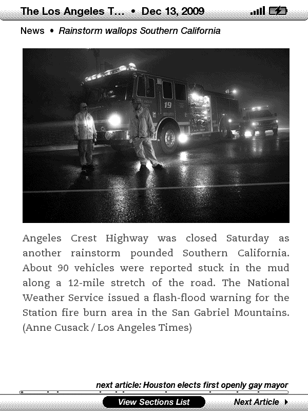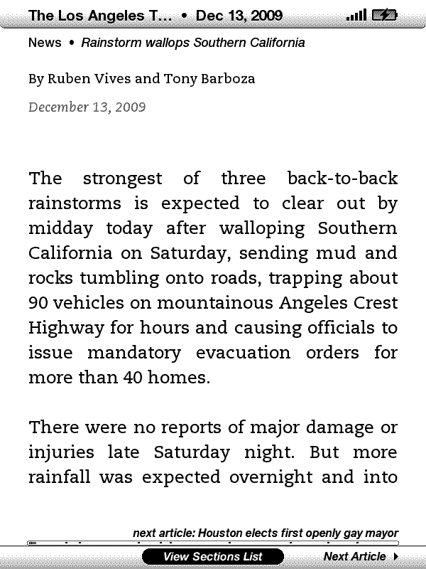 I just thought I'd share a little visual example of how well, Calibre works on newspaper subscriptions for the Kindle (and most if not all of the current ebook readers). You can use nearly any newspaper or magazine with a proper RSS feed to create a "subscription" book of articles (you can even choose which sections you want and don't want in your "subscription" book).