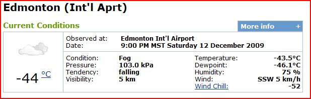Cold snap should break by the end of the week.The low temperatures last night actual demonstrate the urban heat island effect nicely: Overnight low at the airport: -46C (15 km from the edge of town) Overnight low downtown: -36C Overnight low on my thermometer: -39C (We're between downtown and the airport - near the edge of town) |